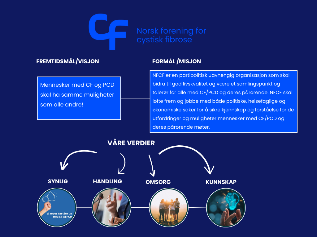 Norsk forening for cystisk fibrose (NFCF) ble etablert 10. desember 1976 med et interimstyre. I dag fungerer vi som en interesseorganisasjon for personer med cystisk fibrose (CF) og primær ciliær dyskinesi (PCD) samt deres nærmeste pårørende. Per i dag er det omtrent 400 personer med CF i Norge, og 80 med pcd, og vi har rundt 1100 medlemmer.